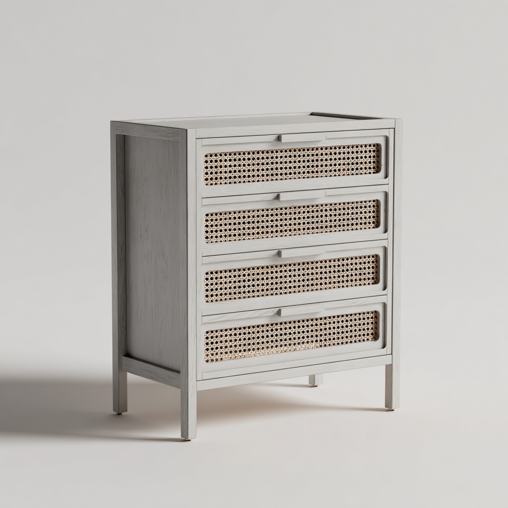La struttura è realizzata in legno con finitura grigio chiaro, abbinata a frontali dei cassetti con inserto intrecciato dall'aspetto naturale. La lavorazione accurata garantisce stabilità e una resa estetica equilibrata.