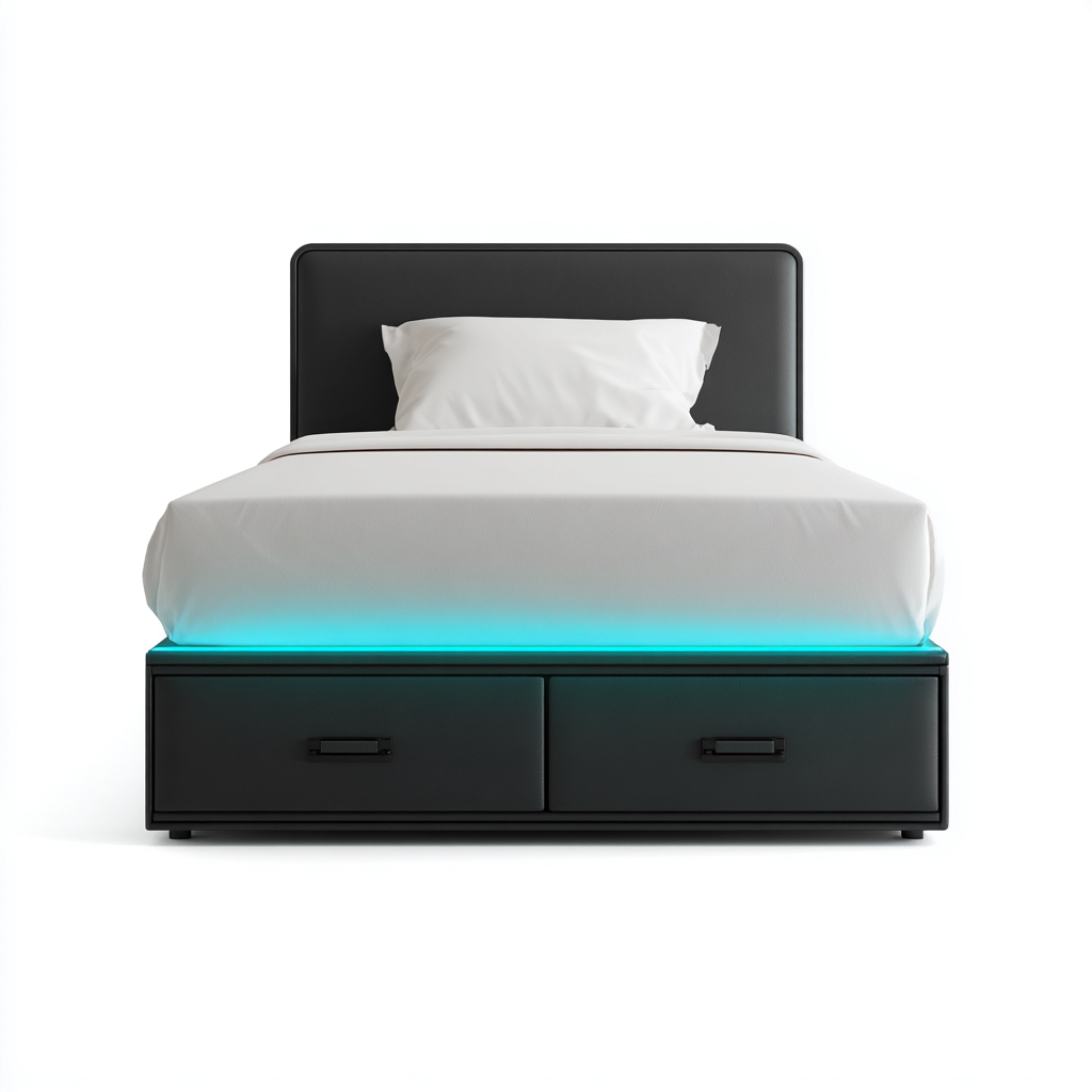 Dotato di due cassetti frontali integrati nella base, utili per organizzare biancheria e oggetti personali. La testiera imbottita assicura comfort durante l'utilizzo quotidiano.