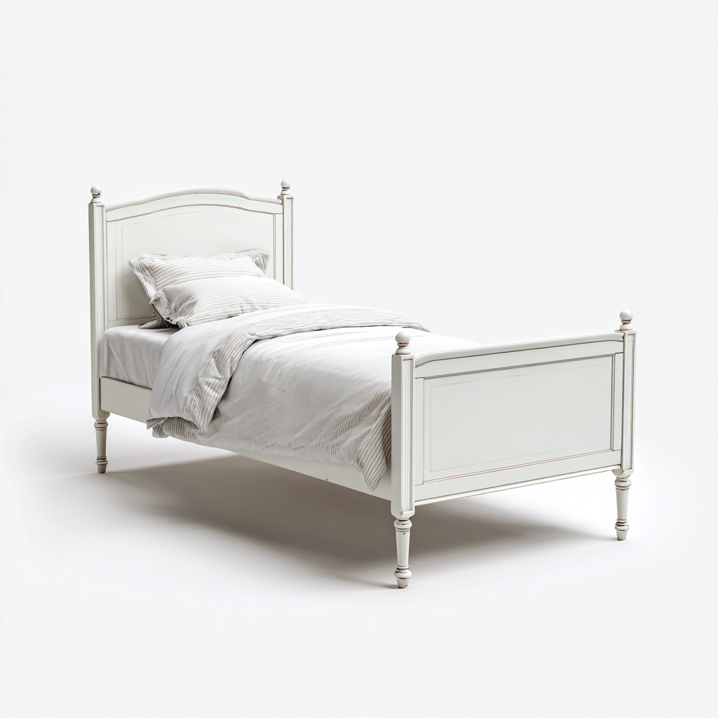 Questo letto singolo è ideale per arredare camere da letto, stanze per ragazzi o ambienti per ospiti con uno stile classico e luminoso. Le linee morbide e la finitura chiara contribuiscono a creare un'atmosfera ordinata e accogliente.