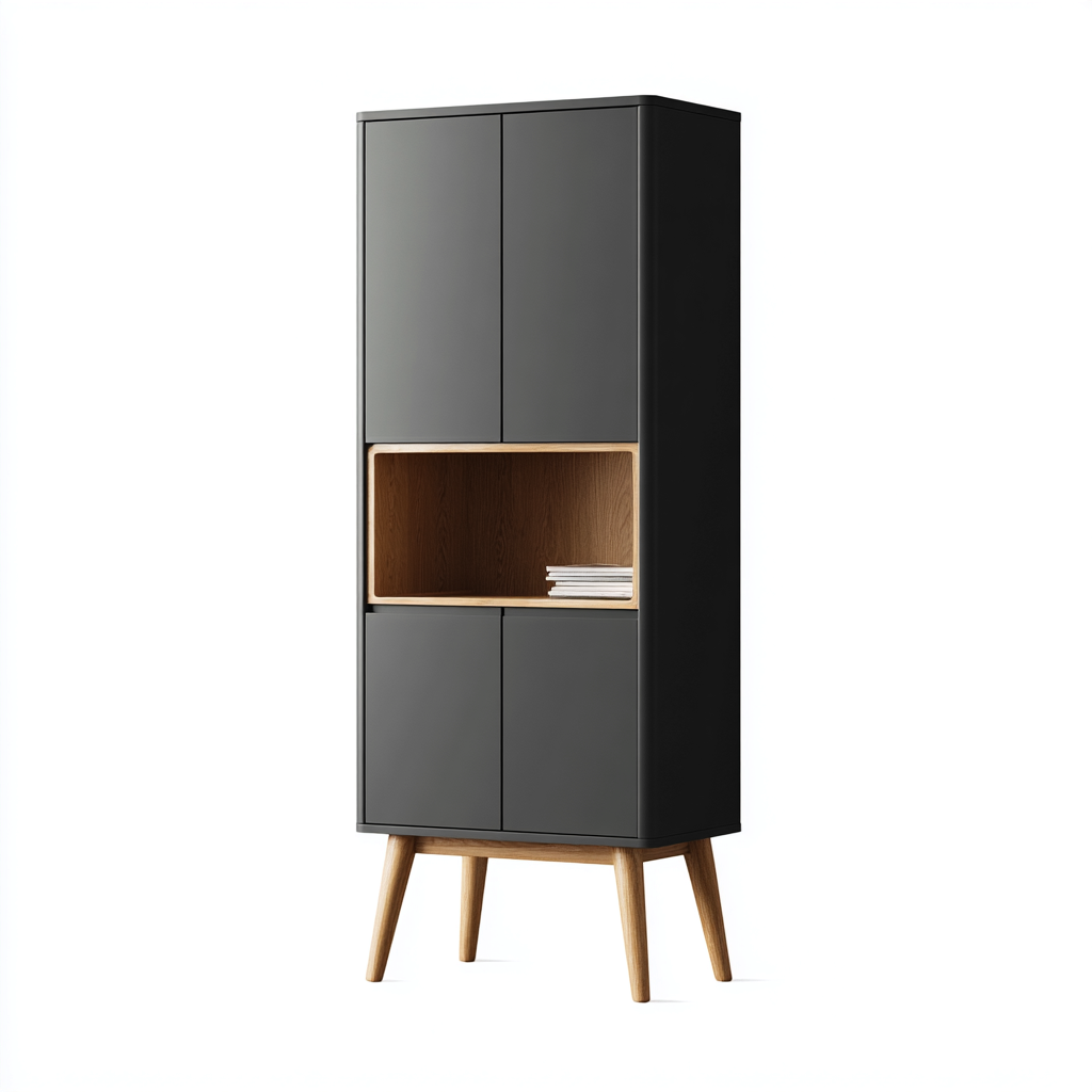 Questo mobile bagno a colonna è pensato per ambienti moderni che richiedono un equilibrio tra estetica essenziale e funzionalità quotidiana. Le linee pulite e il contrasto tra superfici scure e dettagli in legno naturale lo rendono adatto a bagni contemporanei e raffinati.