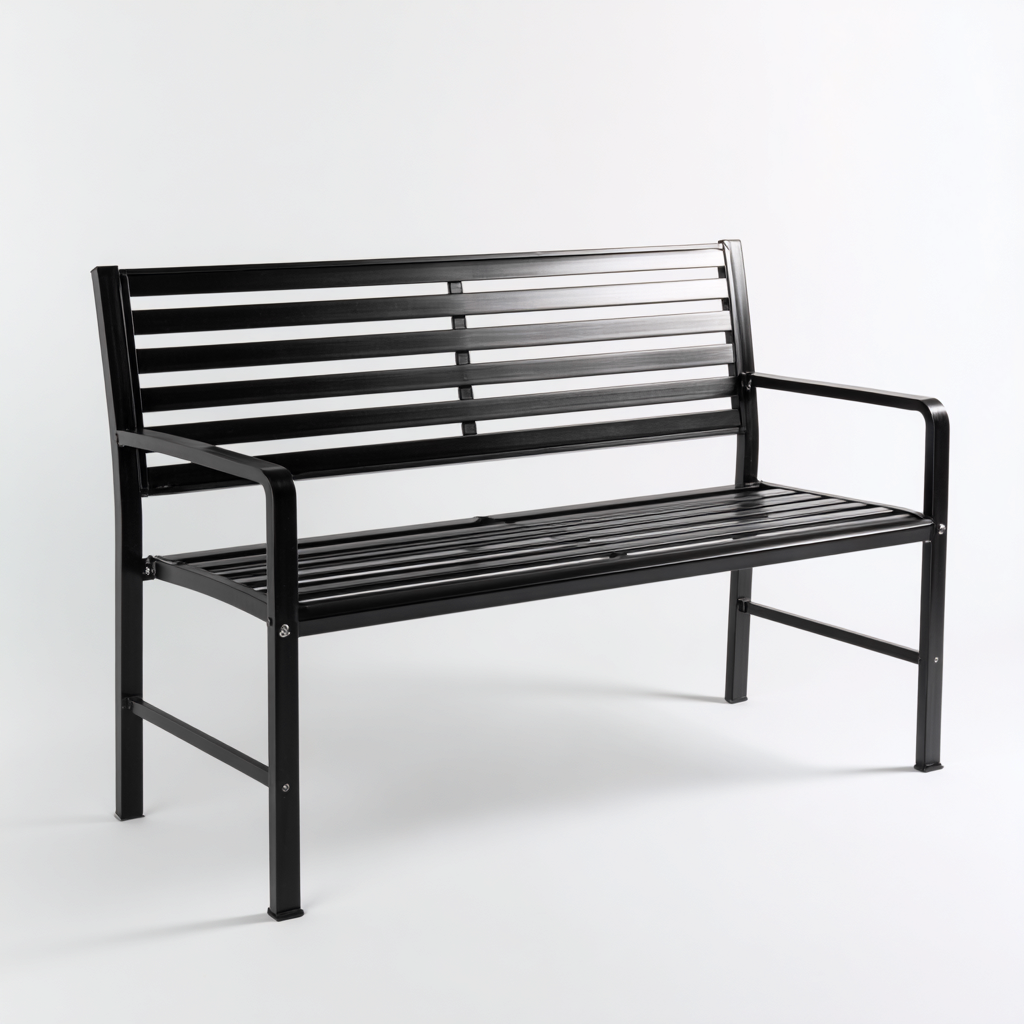 Panca da giardino in metallo dal design moderno e lineare, ideale per arredare con sobrietà giardini, terrazze e spazi esterni. La struttura con schienale e braccioli offre una seduta stabile e funzionale per l'uso quotidiano.
